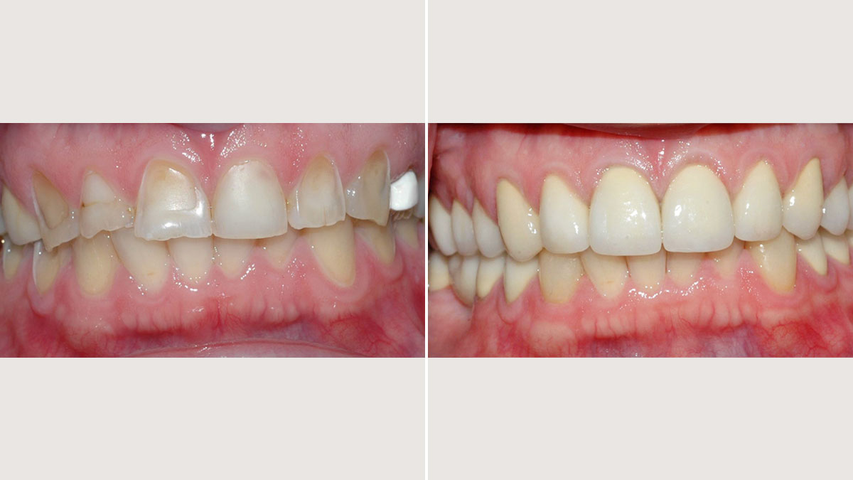 Lateral incisor replaced by implant supported crown and new crown on central incisor.
